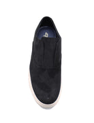 These stylish slip-on trainers are crafted from soft black synthetic suede leather. They feature a sleek cup sole and elegant perforated brogue detailing, making them suitable for both casual and refined looks.