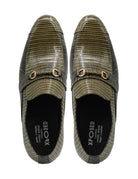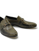 These stylish slip-on loafers from crafted from genuine patent shiny leather. Features two tone snakeskin effect uppers with metal front buckle. Leather lining, Man-made synthetic sole, Side elastic inserts