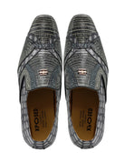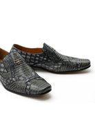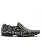 Black and grey two-tone snakeskin embossed loafers with a real leather back offer a modern twist on classic footwear. Crafted from genuine leather, these loafers boast a striking two-tone snakeskin embossed print. They exude standout style and premium craftsmanship, making them perfect for various occasions, from parties and weddings to ceremonies and native wear.